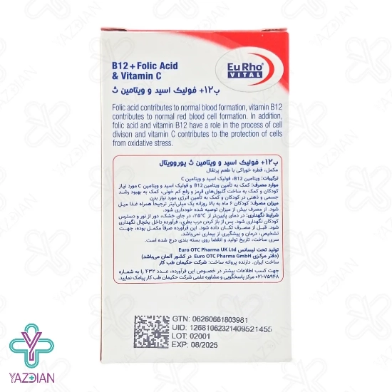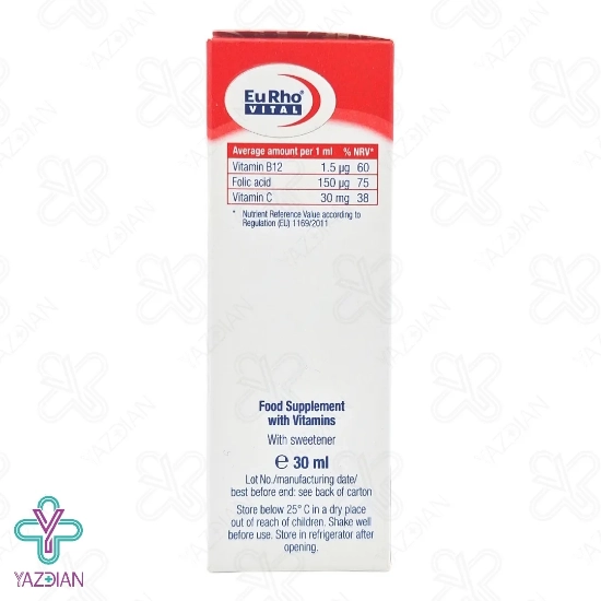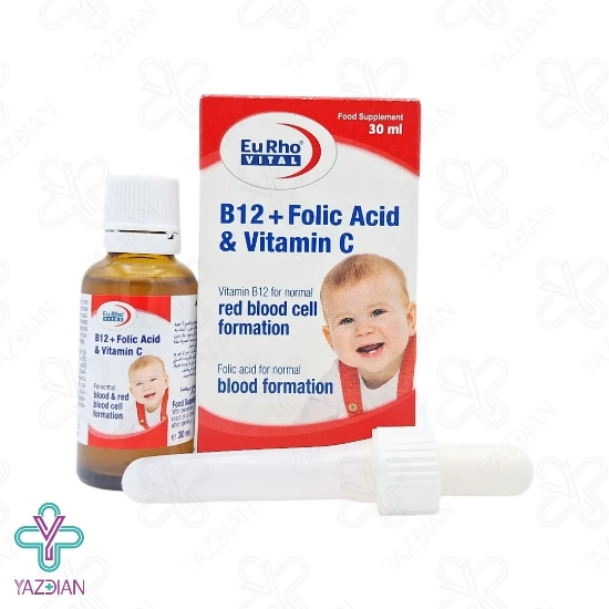 قطره ب12 فولیک اسید و ویتامین ث یوروویتال (Eurhovital B12 Folic Acid And Vitamin C Drops – 30 ml) به بهبود رشد جسمی و ذهنی کودکان کمک کرده و هم چنین انرژی مورد نیاز بدن را نیز فراهم می کند، از دیگر ویژگی های این محصول این است که به ساخت گلبول های قرمز و برطرف شدن کم خونی بسیار کمک می کند، این قطره دارای طعم دل نشین پرتقال است و سیستم ایمنی را تقویت کرده و این توانایی را دارد که شدت و مدت بیماری های عفونی به ویژه سرماخوردگی را کاهش دهد، ویتامین ب12 از ترکیبات به کار رفته در این قطره است که برای رشد و تکامل شناختی کودک بسیار لازم بوده و هم چنین انرژی بدن کودک را فراهم کرده و به همراه فولیک اسید باعث خون سازی می شود، فولیک اسید از دیگر ترکیبات موجود در این محصول بوده و برای رشد و نمو کودکان الزامی بوده و به تامین انرژی و کم شدن حس ضعف در کودکان نیز کمک می کند و علائم کم خونی به خصوص تالاسمی مینور را کاهش می دهد، وجود ویتامین سی نیز که دارای خواص آنتی اکسیدانی موثر و قوی است از سلول ها در مقابل آسیب اکسیداتیو حفاظت کرده و انرژی مورد نیاز کودکان را تامین می کند و محرک تولید کلاژن بوده و سبب حفظ سلامت پوست و استخوان سازی می شود.