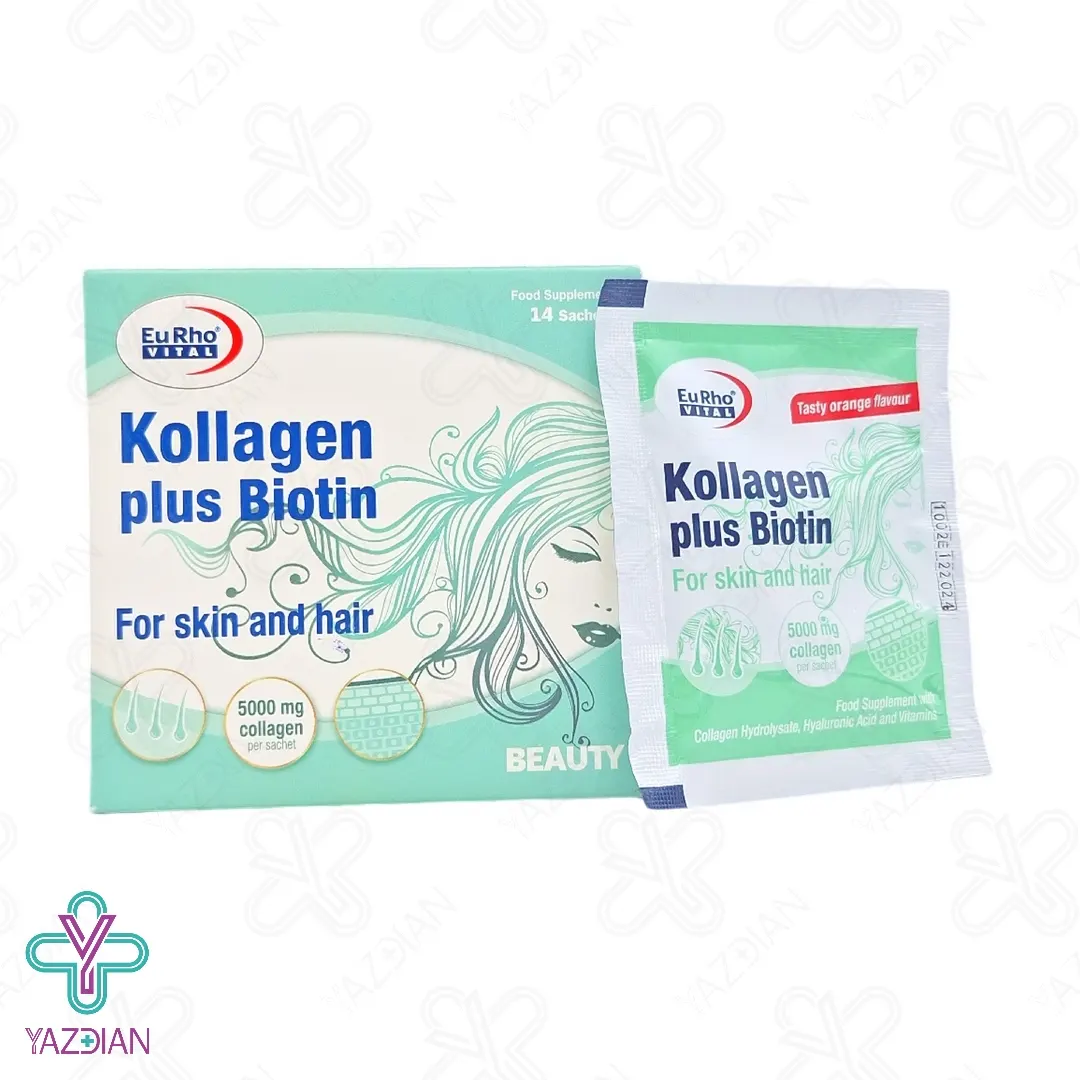 ساشه کلاژن پلاس بیوتین یوروویتال - 14 عددی (Eurhovital Kollagen Plus Biotin 14 Sachets) با بهره گیری از بیوتین، هیالورونیک اسید و ویتامین سی در فرمولاسیون خود، عملکرد فوق العاده ای در تحریک کلاژن سازی پوست داشته و در جوانسازی پوست نیز نقش موثری دارد. بعلاوه با تقویت ساختار پوست، چین و چروک های پوستی را برطرف کرده و تاثیر چشمگیری روی پوست، مو و ناخن دارد.