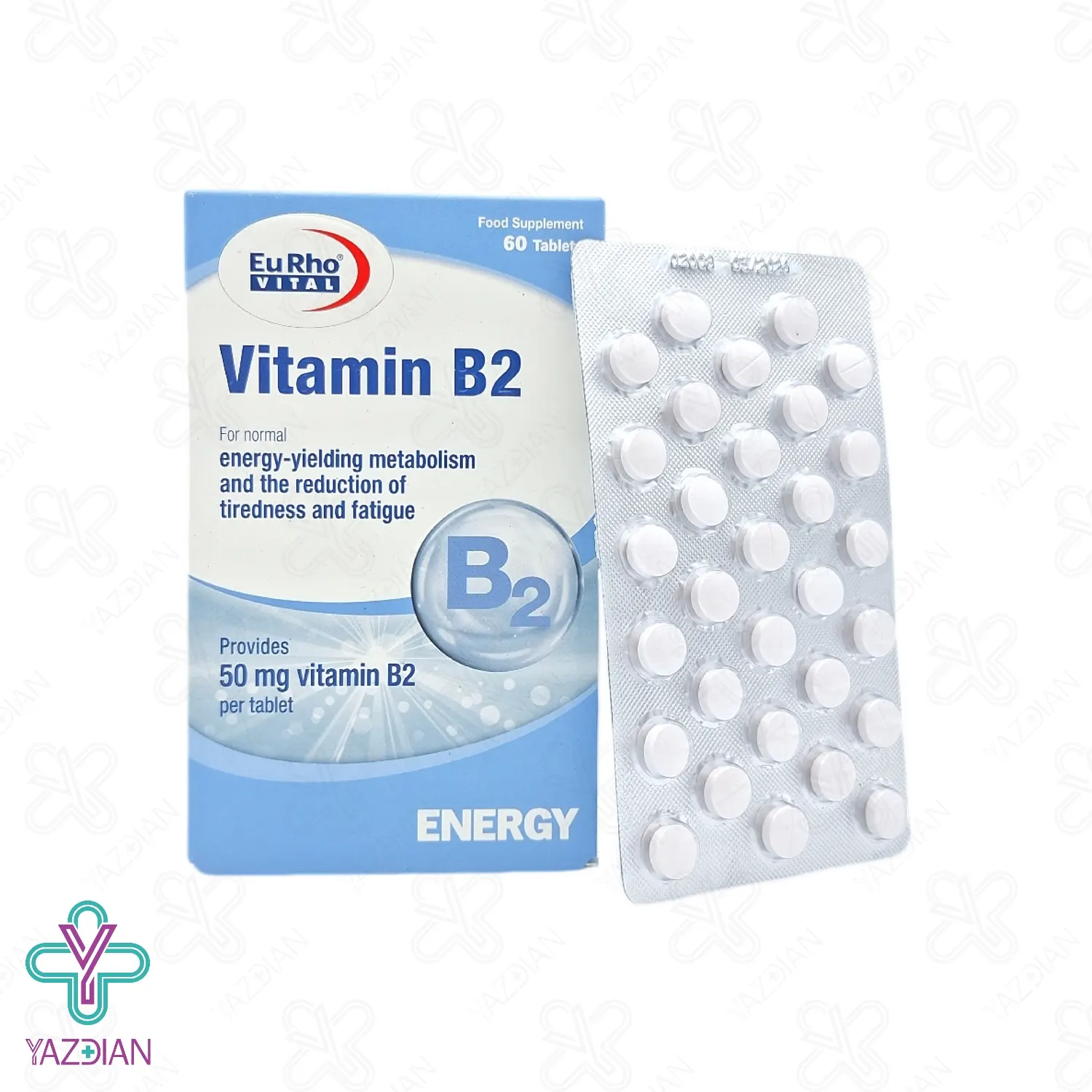 قرص ویتامین ب 2 یوروویتال (Eurhovital Vitamin B2 – 60 Tablets) یک مکمل غذایی بوده و برای زیاد شدن میزان انرژی بدن و کم شدن ضعف و خستگی مصرف می شود.