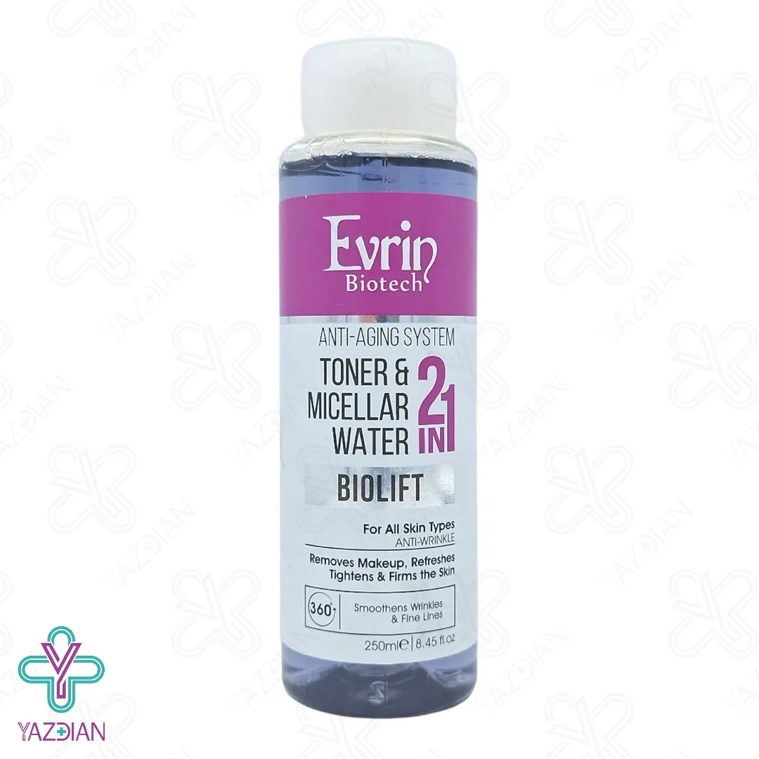 محلول پاک کننده آرایش و ضد چروک اورین - 250 میلی لیتر (Evrin Biotech Biolift Micellar Water 250ml) ضمن پاکسازی کامل پوست از آلودگی ها، چربی های اضافه و مواد آرایشی از منافذ پوستی، رطوبت رسان عالی و موثر پوست می باشد که از خشکی و دهیدراته شدن پوست جلوگیری کرده و شادابی و طراوت آن را نیز دو چندان می کند. بعلاوه در محو سازی لک و تیرگی های ایجاد شده ناشی از افزایش سن و آفتاب نیز نقش موثری دارد. ویژگی های این فراورده تنها به همین ها ختم نشده و بلکه در بهبود بخش چین و چروک های سطحی پوست نیز می باشد و کمک به داشتن پوستی صاف و یکدست می کند.