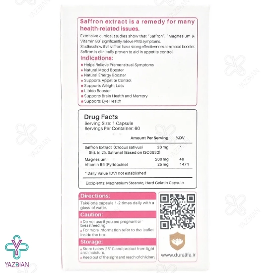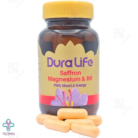 کپسول سافرون منیزیم و ب6 دورالایف فاران شیمی (Faran Shimi Dura Life Saffron Mangnesium And Vitamin B6 60 Caps) یکی از بهترین داروهای تقویتی بدن می باشد که با بهره گیری از ترکیبات مؤثر و مفید خود می تواند عملکرد مغز و حافظه را بهبود بخشیده و سطح انرژی بدن را نیز ارتقا ببخشد. این مکمل همچنین می تواند علائم سندروم پیش از قاعدگی را بهبود بخشیده و برطرف نماید.