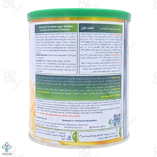 برای آماده کردن یک وعده غذایی 230 میلی لیتری ابتدا 195 میلی لیتر آب سرد را داخل ظرف ریخته و 6 پیمانه (54 گرم پودر فست میل) را به تدریج به آب اضافه نموده و خوب به هم بزنید تا پودر کامل حل شود. هر میلی لیتر محلول آماده شده محتوی یک کیلو کالری انرژی است