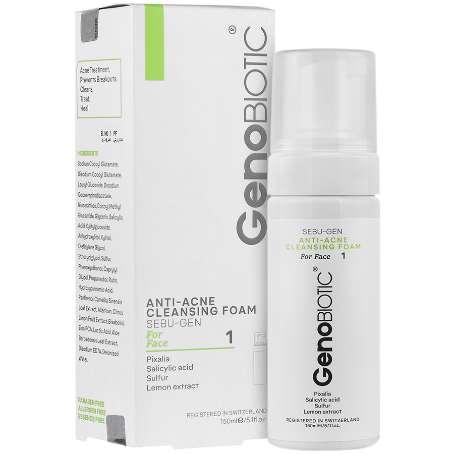 فوم آنتی آکنه ژنوبایوتیک (GenoBiotic anti-acne Foam – 150 ml) پوست را از مواد آرایشی، چربی و انواع آلودگی ها پاک سازی می کند، از دیگر ویژگی های این محصول این است که با لایه برداری ملایم پوست را برای جذب مواد و ترکیبات موثر آماده می کند، این فوم مناسب استفاده به صورت روزانه بوده و هم چنین از به وجود آمدن خشکی، حساسیت و جوش و آکنه بر روی پوست جلوگیری می کند.