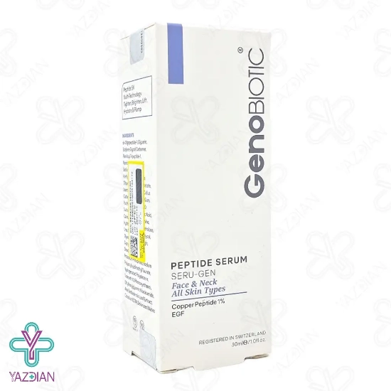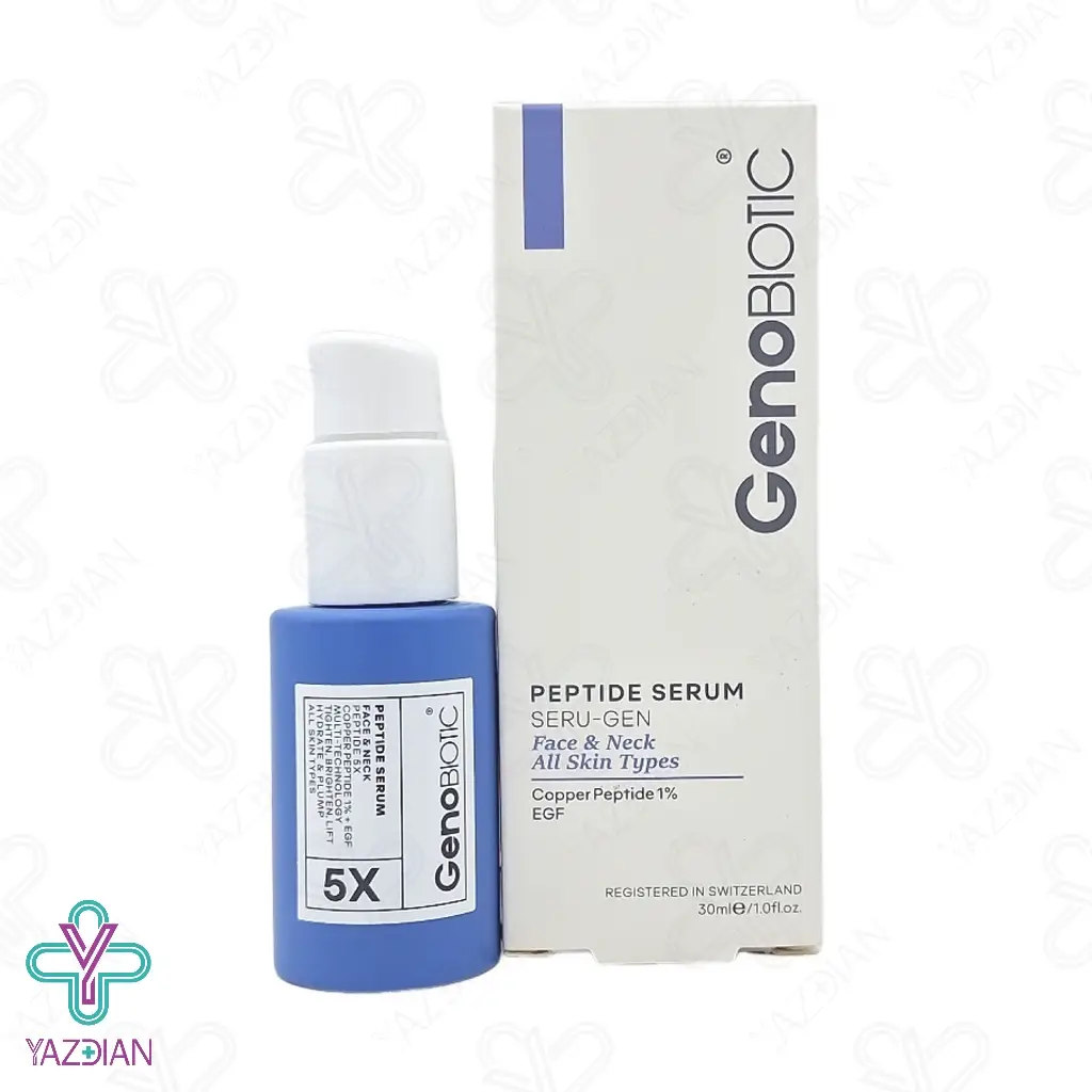 سرم پپتاید یک درصد صورت و گردن ژنو بایوتیک (Genobiotic Peptide Serum – 30 ml) دارای ترکیبات موثری است که موجب تحریک سلول های پوستی به صورت هم زمان شده و در نتیجه سنتز کلاژن و الاستین را افزایش می دهد این محصول با دارا بودن پپتایدهای موثر موجب کاهش چین و چروک پوستی می شود و موجب بهبود استحکام و خاصیت ارتجاعی پوست می شود سرم پپتاید ژنو بایوتیک پوست را به صورت عمقی آب رسانی کرده و مانع از خشکی و کشیدگی پوست می شود و به درخشش و شادابی آن کمک می کند این محصول با بافت سبکی که دارد سریع در پوست جذب شده و قابل استفاده برای انواع پوست می باشد هیالورونیک اسید موجود در این محصول موجب آب رسانی صورت و گردن شده و موجب نرم شدن پوست می شود ویتامین سی موجود در این محصول به روشن شدن پوست کمک کرده و تولید پروتئین کلاژن در پوست را تقویت می کند پروتئین آلبومینوئید موجود در این محصول از عصاره مروارید موجب ترمیم و بازسازی بافت پوست شده و از چین وچروک های سطحی پوست صورت و گردن نیز جلوگیری می کند.