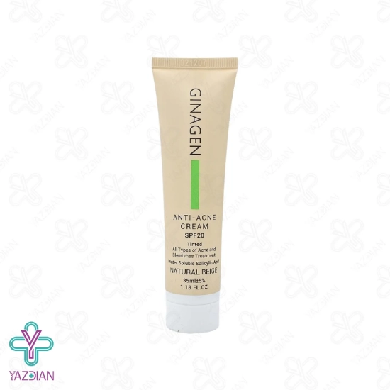 کرم آنتی آکنه SPF20 ژیناژن - بژ طبیعی (Ginagen Natural Beige Anti Acne Cream SPF20) یک کرم چند منظوره و چند کاربره می باشد که با کنترل ترشح چربی پوست، جوش و آکنه های پوستی را درمان کرده و آثار به جای گذاشته از آن ها را برطرف می کند. بعلاوه با بهره گیری از ترکیبات التیام بخش، خارش، قرمزی و بر افروختگی های پوستی را برطرف می کند. بعلاوه خاصیت آنتی اکسیدانی قوی ای داشته و رادیکال های آزاد را از بین می برد.