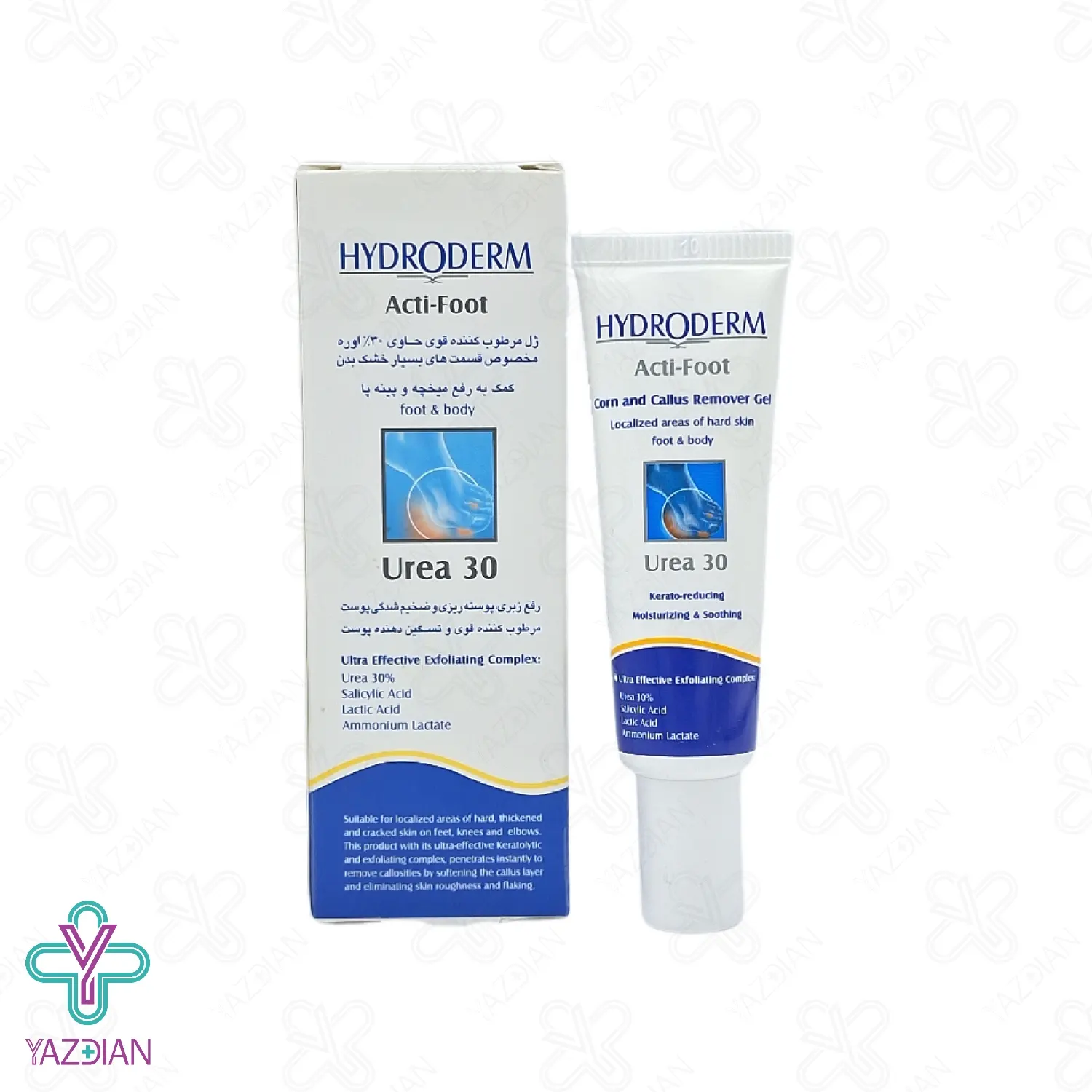 ژل رفع میخچه و پینه پا هیدرودرم حاوی اوره 30 درصد - 75 میلی لیتر (Hydrederm Acti Foot Moisturizing Gel 30 g) با بهره گیری از ترکیبات لایه بردار، لایه شاخی و زبر پوست را از بین برده و بدین گونه سبب از بین بردن پینه، میخچه و ضخیم شدگی های پوستی می شود. بعلاوه با بهره گیری از مشتقات آلفا هیدروکسی اسیدها، خارجی ترین لایه پوست را را مرطوب نگهداشته و مانع از بروز ترک خوردگی های عمیق و شدید، فلسی شدن پوست، پوسته ریزی و خشکی های پوستی می شود. این کرم قابل استفاده برای پاشنه، آرنج ها، زانوها، قوزک پا و یا سایر نواحی بدن می باشد.