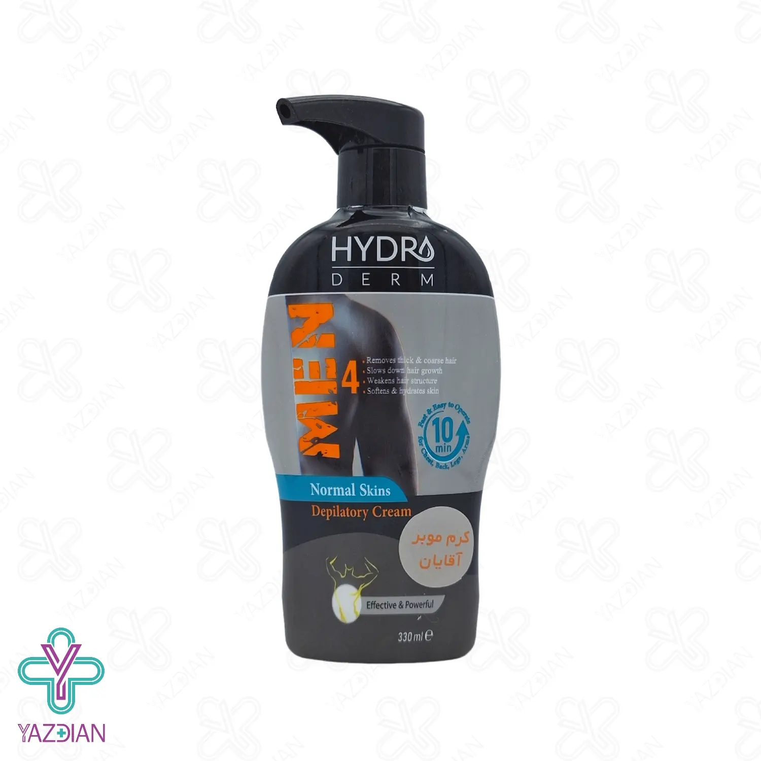 کرم موبر بدن آقایان هیدرودرم - 330 میلی لیتر (Hydroderm Men Depilatory Cream for Sensitive Skins 330 ml) از دسته محصولات اصلاح صورت و بدن می باشد که ظرف مدت 10 دقیقه کلیه موهای زائد ناحیه مورد نظر را از بین می برد. این محصول کاردک مخصوص داشته و پمپی بودن این محصول، استفاده از آن را بسیار آسان و سریع می کند. این محصول کلیه موهای زائد، ضخیم مقاوم و کوتاه در مردان را از بین می برد.