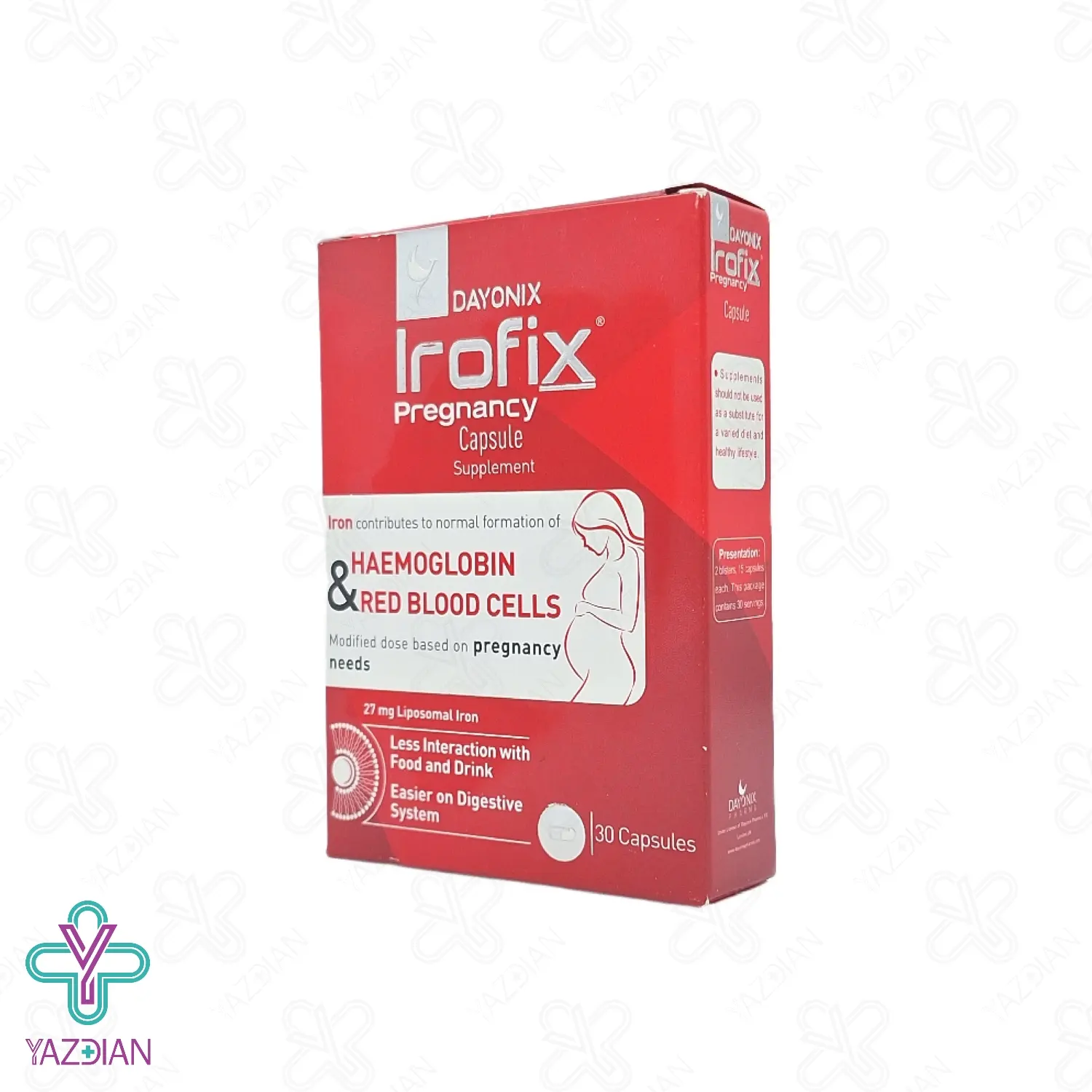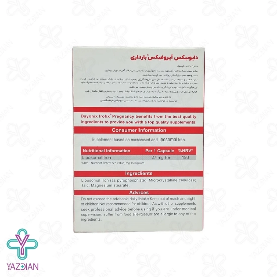 بنابراین در این دوره علاوه بر تغذیه باید از مکمل هایی که حاوی آهن می باشند استفاده کرد، کپسول آهن دوران بارداری آیروفیکس(Irofix pregnancy iron capsules – 30pcs) دارای آهن پیروفسفات لیپوزومال می باشد که کم خونی ناشی از کمبود آهن را در مادران باردار بهبود بخشیده و آهن مورد نیاز آن ها را فراهم می کند، این محصول به علت دارا بودن آهن میکرو کپسوله شده هیچ گونه طمع آهن در دهان ایجاد نکرده و سبب سیاه وکدر شدن دندان ها نمی شود وهم چنین مشکلات گوارشی نیز به همراه ندارد، کپسول آهن آیروفیکس به دلیل سیستم کپسوله بر روی مواد غذایی تاثیر نگذاشته و موادی مانند ویتامین ها یا اسیدهای چرب در برابر اکسیداتیو آهن محافظت شده و سبب می شود ارزش غذایی محصول حفظ شود.