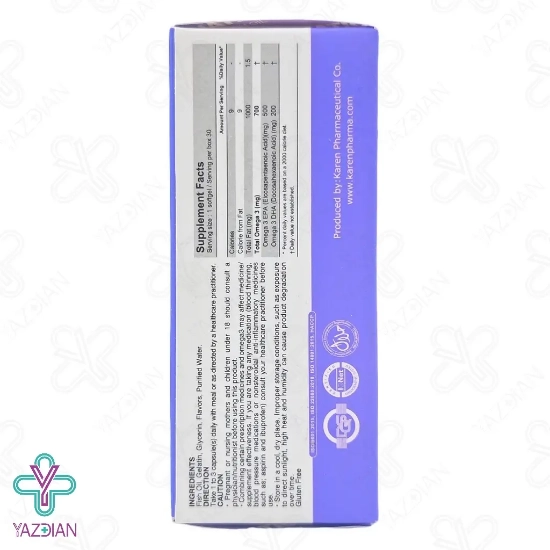 سافت ژل امگا3 ای پی ای آکواتیک بالا کارن - 30 عددی (Karen Fish Oil High EPA Quatic 30 Soft Gels) منبع غنی ای از اسید های چرب بلند زنجیره غیر اشباع امگا ۳ می باشد که مزایای بسیاری هم برای بدن دارد که این اسید های چرب به صورت ارگانیک در دانه کتان، لوبیاها و گیاهان می باشد.
