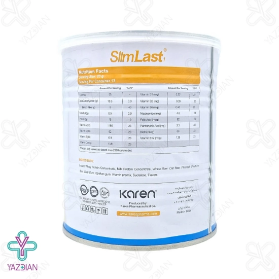 پودر لاغری اسلیم لست وانیل کارن - 300 گرم (Karen Slim-Last-1 pro. Fiber 300 g) با بهره گیری از مقادیر چشم گیری پروتئین و فیبر غذایی در فرمولاسیون خود، عملکرد فوق العاده ای در کاهش اشتهای فرد و کاهش وزن داشته و با برخورداری از ویتامین های لازم بدن در دوران کاهش وزن، کلیه نیاز های فرد را تامین می کند. این محصول در واقع فقط یک مکمل کاهش وزن نیست بلکه تامین کننده پروتئین ها، ویتامینها و مواد معدنی مختلف مورد نیاز بدن می باشد. در فرمولاسیون این مکمل هیچ گونه مواد افزودنی با اثر کاهش اشتها و پیشگیری از ابتلا به یبوست استفاده نشده است.