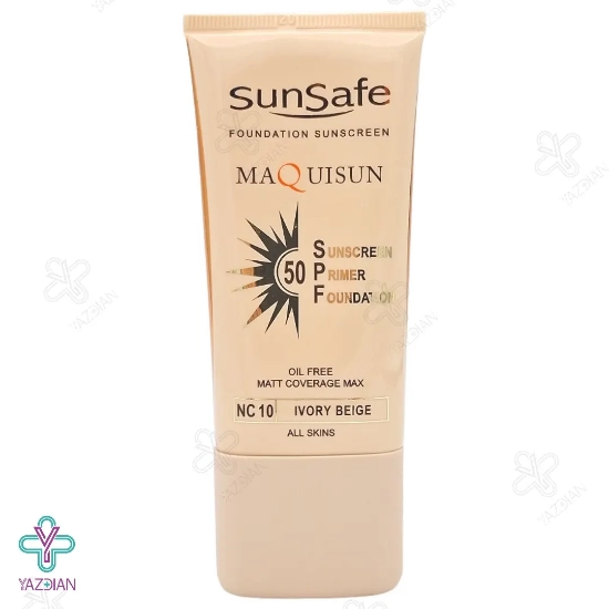 کرم ضد آفتاب SPF50 پودری و پرایمری سان سیف - بژ عاجی (Maquisun Foundation Sunscreen SPF50) حاوی کو آنزیم کیوتن، عصاره چای سبز و زینک اکساید می باشد. این کرم ضد آفتاب یک لایه محافظتی با قدرت زیاد روی پوست ایجاد کرده که اثرات مخرب اشعه های مضر خورشید UVA,UVB,IR را مهار و خنثی می کند. ضمنا قادر است تا پوست را بطور عمقی مرطوب و آبرسانی کرده و رطوبت پوست را حفظ کند.