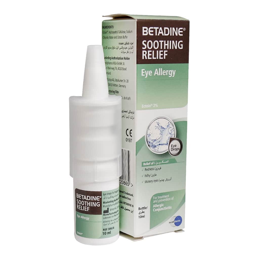آلرژی چشمی نوعی واکنش سیستم ایمنی بدن به گرد و غبار، گرده و ... می باشد که موجب خارش، آبریزش و تاری دید می شود گاهی اوقات این علائم با قرمزی و ریزش اشک و سوزش چشم نیز همراه است قطره استریل چشمی ضد آلرژی بتادین موندی فارما (Mundi pharma Betadine Soothing relief eye Allergy - 10 ml) دارای 2 درصد اکتوئین می باشد که موجب رفع قرمزی، خارش و اشک چشم می شود در این محصول از مواد نگه دارنده استفاده نشده است زمانی که از این محصول استفاده می کنید عوامل حساسیت زا مانند گرده، ذرات غبار به چشم نفوذ پیدا نمی کند اکتوئین موجود در این محصول موجب تقویت غشای طبیعی محافظ چشم می شود قطره استریل چشمی بتادین موندی فارما بسیار مناسب برای چشم های حساس و هم چنین افرادی که از قطره های چشمی دارای آنتی هیستامین، کورتیکواستروئید دکونژستانت و محلول های لنز استفاده می کنند مناسب می باشد این محصول مانع از ورود عفونت های باکتریایی و ویروس تنفسی و چشمی به مخاط چشم می شود.