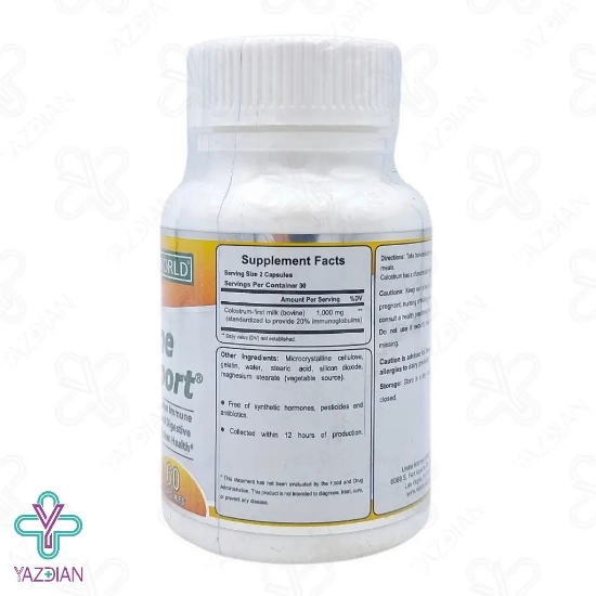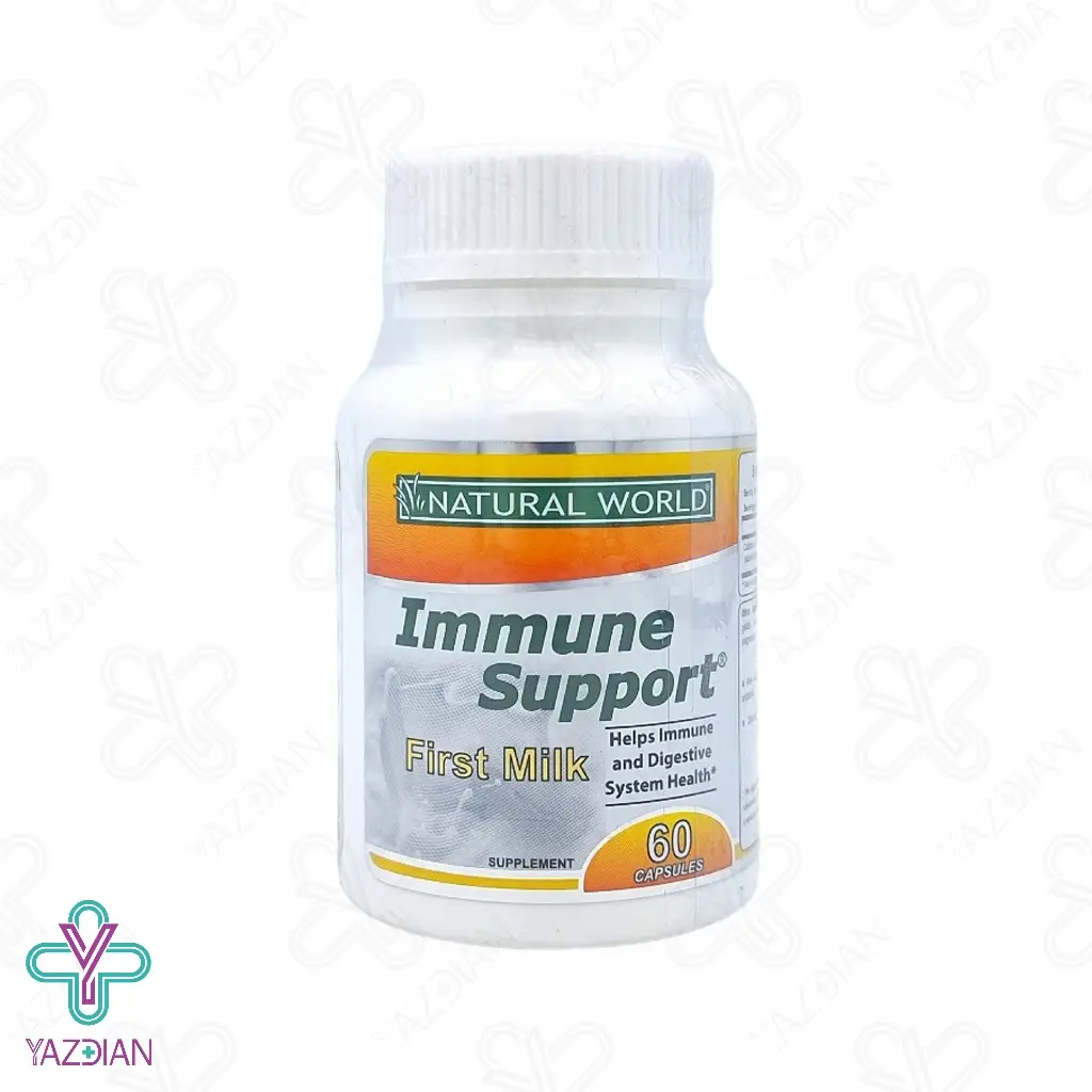 کپسول ایمیون ساپورت نچرال ورلد (Natural World immune support capsules – 60 pcs) با دارا بودن کلستروم یا آغوز گاوی موجب تقویت سیستم ایمنی می شود آغوز در واقع همان شیری است که ابتدای تولد نوزاد در سینه مادر تولید می شود که موجب تقویت سیستم ایمنی نوزاد می شود آغوز دارای پروتئین های لاکتوفرین، مواد معدنی ، آنتزیم ها، ویتامین ها و فاکتورهای مهم رشد می باشد که موجب تقویت سیستم ایمنی و محرک رشد سلولی می شود و موجب ارتقا سلامتی می شود کلستروم گاوی دارای لاکتوفرین و آنتی بادی ها بوده که با باکتری و ویروس ها مقابله می کندکپسول ساپورت نچرال ورلد ضمن تقویت سیستم ایمنی موجب عملکرد بهتر دستگاه گوارش بدن و کاهش علائم عفونت های تنفسی می شود و هم چنین به واسطه دارا بودن کلستروم آغوز التهابات آلرژیک را از بین برده و در هر سنی می توان آن را استفاده کرد.