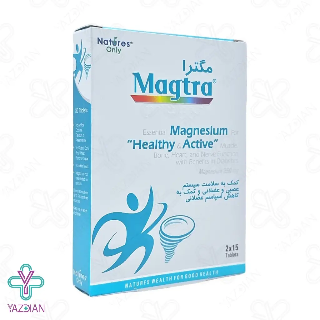 قرص منیزیم 350 مگترا نیچرز اونلی (Natures only Magtra Magnesium 350 tablets mg – 30 pcs ) یک مکمل جهت بهبود سیستم عصبی، تجزیه مواد غذایی به ریز مغذی ها، عملکرد عضلات، استحکام استخوان ها و دندان و تقسیم سلولی مورد نیاز می باشد، قرص منیزیم موجب شل شدن و رفع گرفتگی عضلات من جمله عضلات قلب می شود، در صورتی که مقدار منیزیم در بدن شما کم باشد به صورت میگرن در سیستم عصبی خود را نشان می دهد، اگر منیزیم به مقدار کافی دریافت کنید موجب کاهش خطر ابتلا به پوکی استخوان، کاهش فشار خون و کاهش استرس می شود، این ماده در بسیاری از مواد غذایی موجود می باشد و به صورت طبیعی تمام منیزیم مورد نیاز خود را دریافت می کنید و هم چنین کلیه ها مقدار منیزیمی که هنگام دفع ادرار از دست می دهیم را در سطح بدن تنظیم می کند و در صورت سطح پایین منیزیم می توانید از مکمل های حاوی منیزیم نیز استفاده کنید، افرادی که بدن آن ها منیزیم کافی ندارد با بی اشتهایی، حالت تهوع، احساس ضعف و خستگی، اسهال، بی حسی، سوزن سوزن شدن و ضربات نامنظم قلب رو به رو هستند، منیزیم نوعی مینرال است که برای بسیاری از آنزیم های بدن مفید می باشد که برخی از آن ها مواد غذایی را به انرژی در بدن تبدیل می کند، این محصول دارای دو شکل مختلف منیزیم شامل سترات منیزیم و اکسید منیزیم می باشد که فاقد رنگ مصنوعی، طعم دهنده، نگه دارنده، گلوتن، ذرت، سویا، گندم، نشاسته، شکر و مخمر می باشد و از ایجاد واکنش و حساسیت احتمالی می کاهد.