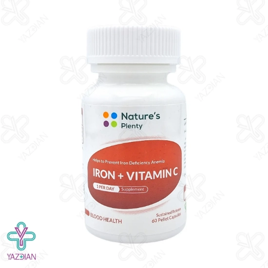 آهن یک ماده ی معدنی مهم است که نقش حیاتی در سلامت گلبول های قرمز دارد که کمبود آن سبب کم خونی ناشی از فقر آهن شده و در نتیجه موجب خستگی های شدید می شود، این بیماری در همه ی سن ها به خصوص در کودکان، خانم های باردار و در دوران قاعدگی بیشتر شایع است، فراهم کردن آهن مورد نیاز از طریق رژیم غذایی امکان پذیر است ولی در بعضی شرایط که نیاز به آهن بالا است استفاده از یک محصول مناسب برای رفع این مشکل توصیه می شود، کپسول آهن آیرون پلاس ویتامین ث نیچرز پلنتی (Natures plenty iron plus vitamin C capsules – 60 pcs) آهن مورد نیاز بدن را تامین کرده و هم چنین برای پیشگیری از کمبود این ماده ی مغذی لازم و ضروری است، از دیگر ویژگی های این محصول آهن موجود در آن است که از نوع بیس گلیسینات بوده و به همین دلیل کمترین عوارض گوارشی را داشته و دارای جذب بهتری نیز است، از دیگر ویژگی های این محصول این است که به تقویت سیستم ایمنی بدن کمک می کند و در نتیجه بدن با بیماری ها و عفونت ها مقابله کرده، این کپسول هم چنین موجب افزایش سطح تمرکز می شود، ترکیب آهن و ویتامین ث در این کپسول باعث جذب بهتر آهن شده و هم چنین زیست دسترسی آن را بهبود می بخشد.