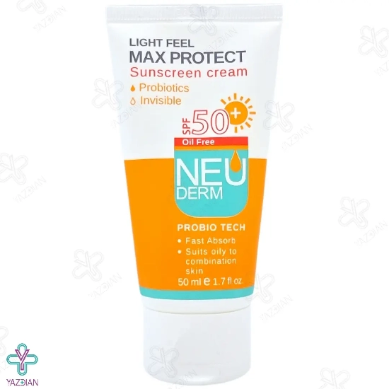 کرم ضد آفتاب SPF 50 فاقد چربی مکس پروتکت نئودرم (Neuderm Max Protect SPF50 Sunscreen Cream For Oily Skin 50 ml) با دارا بودن ترکیباتی مؤثر و قدرتمند نظیر روغن درخت چای، آلفابیزابولول و پروبیوتیک می تواند به خوبی از پوست در برابر پرتوهای UVA و UVB محافظت کرده و ترشح سبوم پوست را تنظیم نماید.