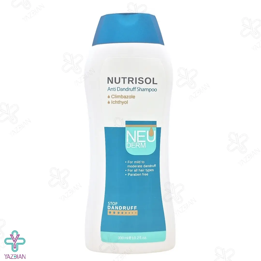 شامپو ضد شوره نوتریسل نئودرم (Neuderm Nutrisol Anti Dandruff Shampoo 300 ml) با دارا بودن ترکیب ضد قارچ اختصاصی کلیمبازول همراه با ایکتیول در فرمولاسیون خود می تواند ضمن بهبود و رفع شوره سر، خارش و التهابات پوست سر را نیز برطرف کند.