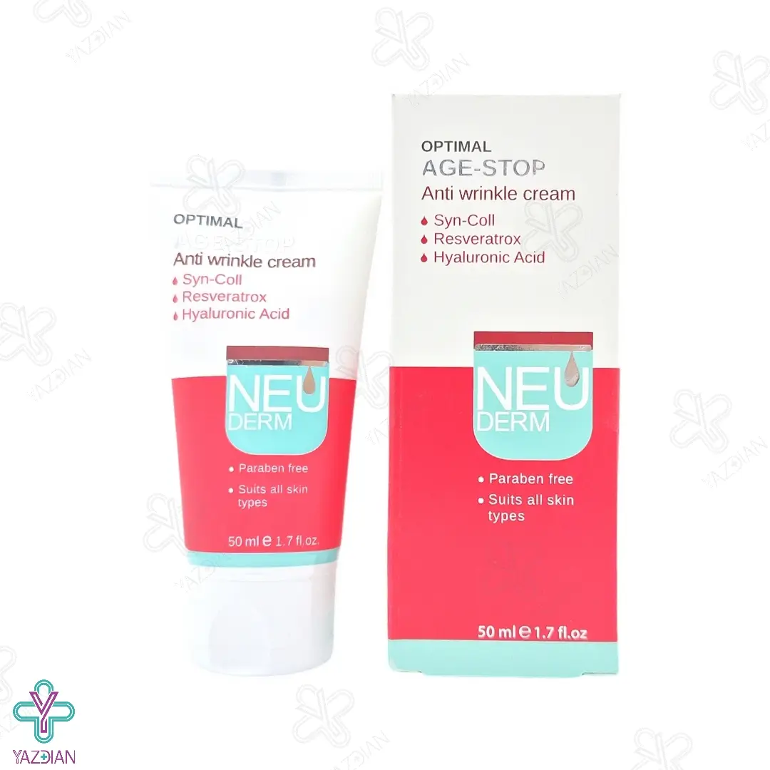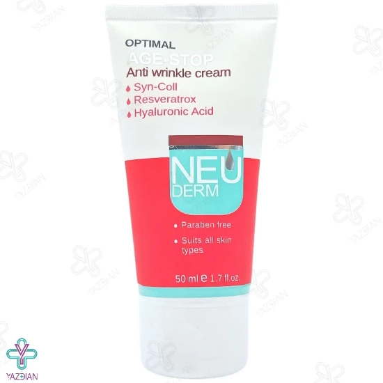 کرم ضد چروک اپتیمال ایج استاپ نئودرم (Neuderm Optimal Age – Stop Anti Wrinkle Cream For All Skins 50 ml) با آب رسانی و مرطوب کردن پوست میزان چین و چروک در آن را کم و هم چنین از آسیب های محیطی حفظ می کند.
