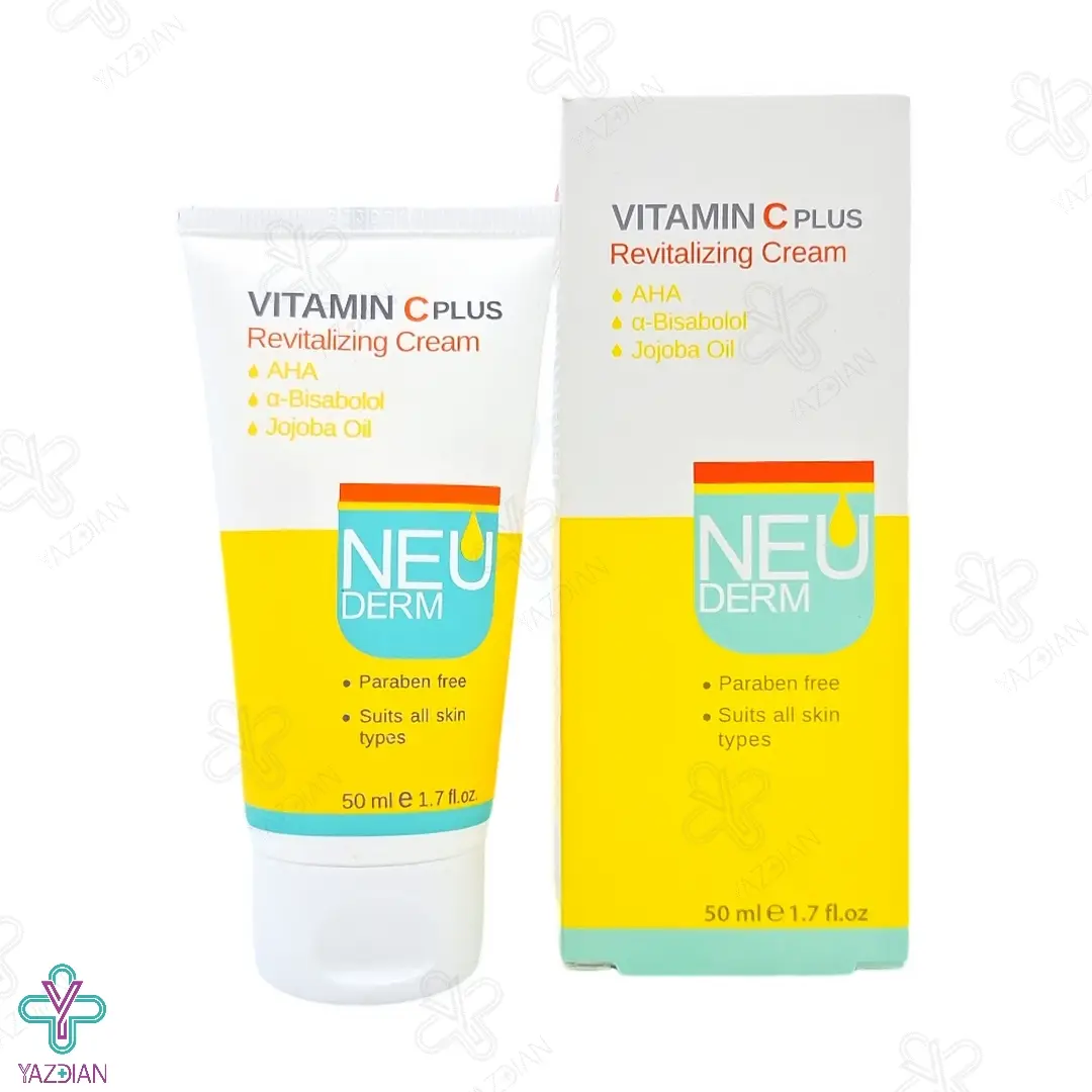 کرم روشن کننده ویتامین ث نئودرم (Neuderm Revitalizing Vitamin C Plus Cream 50 ml) با دارا بودن ویتامین های C، A و E به همراه روغن جوجوبا در ترکیبات خود می تواند پوست را به خوبی روشن کرده و بازسازی کلاژن در پوست را تحریک کند و به واسطه آن قوام پوست را افزایش داده و باعث جوان سازی پوست شود.