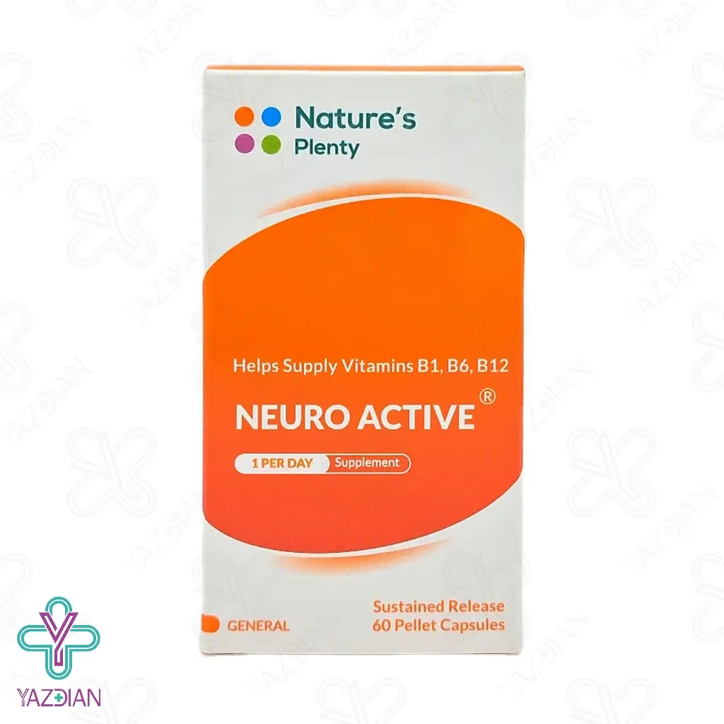 ویتامین های گروه ب نوعی از ویتامین ها میب اشد که بدن قادر به ساهت آن ها نمی باشد و از غذای روزانه جذب بدن می شود اما گاهی اوقات غذا پاسخگوی تامین ویتامین ها نبوده و باید از مکمل های حاوی این نوع ویتامین استفاده کرد، کپسول نرو اکتیو نیچرز پلنتی (Neuro active Netures Plenty Capsules – 60 pcs) غنی از ویتامین های گروه ب می باشد که موجب بهبود عملکرد دستگاه عصبی شده و هم چنین موجب افزایش سطح انرژی نیز می شود، این محصول با ترکیباتی که دارد موجب اکسیژن رسانی کافی به مغز شده و سیستم ایمنی را نیز تقویت می کند و موجب بهبود و تنظیم اختلالات خواب می شود، این محصول هم چنین ضمن حفظ سلامت قلب و عروق موجب درمان و پیش گیری از کم خونی می شود، از آن جایی که این محصول آهسته روش می باشد یعنی ماده موثره خود را به صورت تدریجی وارد بدن می کند از این رو این محصول عوارض جانبی کمتری را خواهد داشت، ویتامین ب1 موجود در این محصول موجب تولید انرژی جهت بازسازی عضله شده و هم چنین خاصیت آنتی اکسیدانی دارد و از بدن در برابر اثرات مخرب رادیکال های آزاد محافظت می کند، ویتامین ب6 نیز نوع دیگر از گروه ویتامین ب موجود در این محصول می باشد که موجب تقویت سلامت اعصاب شده و بهبود عملکرد سیستم عصبی نیز کمک می کند، ویتامین ب12 موجود در این محصول موجب افزایش سطح انرژی می شود.