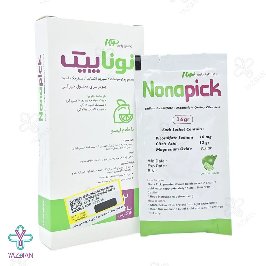 ساشه نوناپیک نونا پارس دارو - 2 عددی (NonaPick Nano Pharma Lemon Flavor 2 Sachets 16 gr) یک مکمل ملین عالی برای بیمارانی که برای اعمال تشخیصی مثل کلونوسکوپی، رفع یبوست، آزمایش های پرتونگاری نیاز به پاکسازی روده ها دارند، می باشد. در این آزمایشات تشخیصی، جهت تشخیص دقیق لازم است تا روده بزرگ به طور کامل پاکسازی شود.