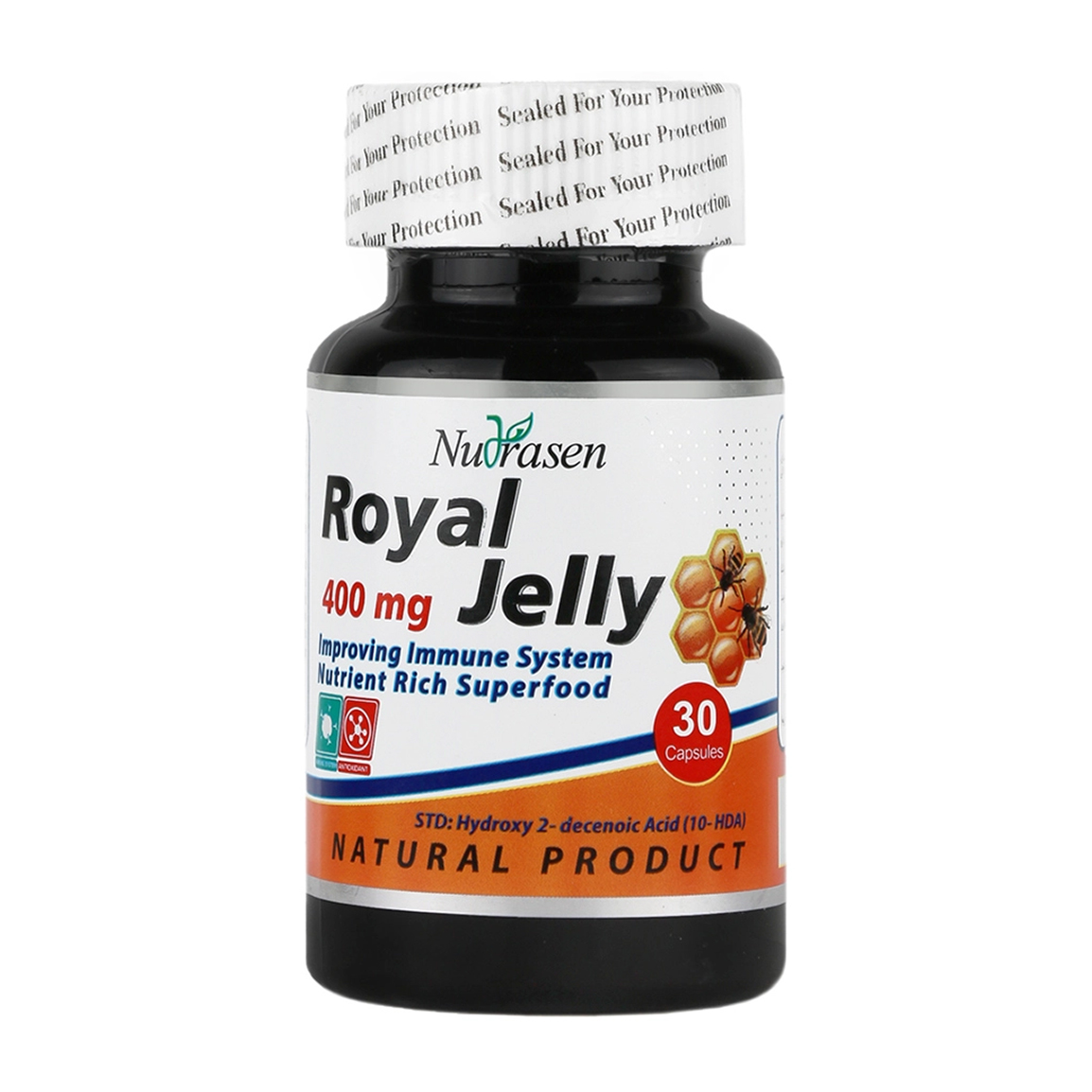 کپسول رویال ژلی 400 میلی گرم نوتراسن - 30 عددی (Nutrasen, Royal Jelly 400mg) یک فراروده ارگانیک و ارزشمند است که با بهره گیری از 400 میلی گرم رویال ژلی در ترکیبات خود، خاصیت آنتی اکسیدانی قدرتمندی داشته که روند پیری را به تاخیر انداخته و قوای جسمی بدن را بالا می برد. با برخورداری از پپتید های ضد میکروبی موجود در رویال ژلی، سیستم ایمنی بدن را تقویت شده و بدن در برابر عفونتهای باکتریایی، ویروسی و قارچی مقاومت بالاتری خواهد داشت. همچنین ریسک ابتلا به بیماری های قلبی عروقی را پایین می آورد و التهابات ناشی از این بیماری ها را می کاهد. همچنین سطح کلسترول بد یا LDL را پایین آورده و سطح کلسترول خوب HDL را زیاد می کند. از دیگر خواص این کپسول می توان به بهبود عملکرد مغز اشاره داشت که میزان تمرکز و حافظه را بالا برده و علائم پیری مغز را کاهش می دهد.