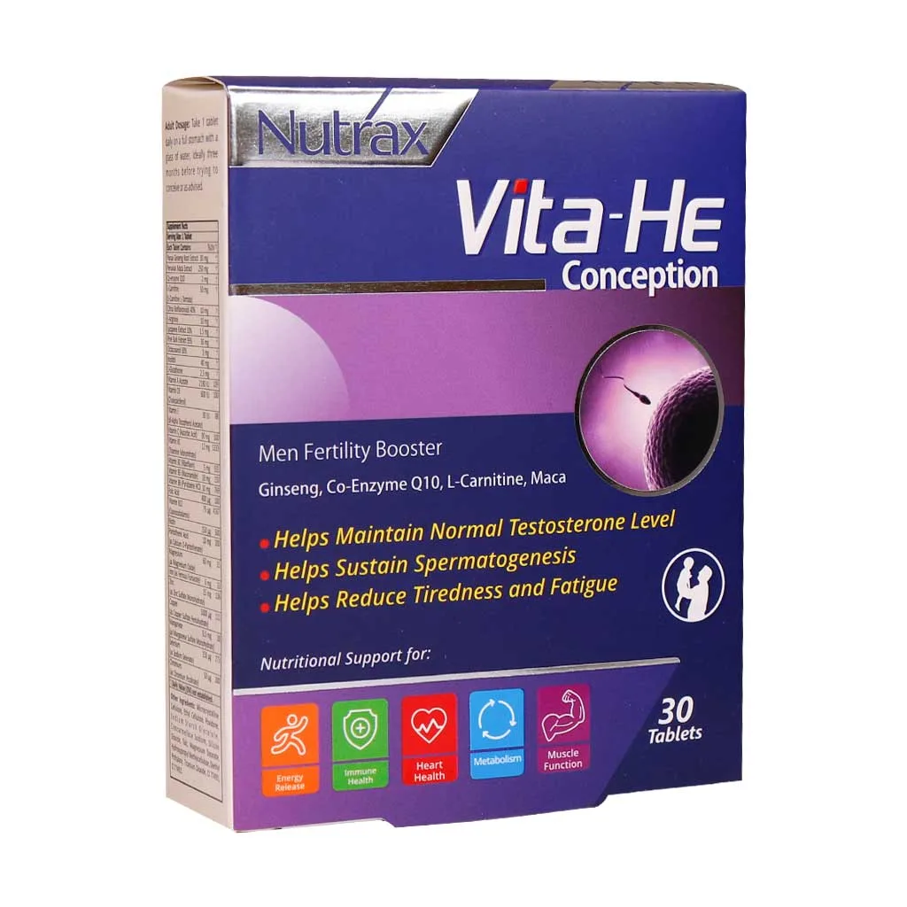 کپسول تقویت آقایان وایتاهی کانسپشن نوتراکس - 30 عددی (Nutrax Vita He Conception 30 Tabs) غنی از ویتامینها، مینرال ها، آمینو اسید ها و عصارههای گیاهی میباشد که تعداد و تحرک اسپرم ها را زیاد می کند و بطور کلی کیفیت اسپرم را بهبود می بخشد و قدرت باروری در آقایان را تقویت می کند. عصاره گیاه جینسینگ پرویی یا ماکا از ترکیبات موثر این کپسول می باشد که طبق تحقیقات انجام شده در تقویت سیستم ایمنی بدن بسیار موثر بوده و بهبود بخش مورفولوژی و حرکت اسپرم در آقایان و افزایش میل جنسی آن ها می باشد.