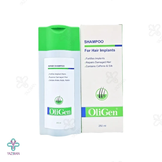 شامپو موهای کاشته شده الی ژن (Oligen Repairs Hair Implants Shampoo With Caffein 250 ml) با دارا بودن کافئین، کراتین هیدرولیز شده، روغن هسته انگور، عصاره های رزماری و بابونه، ویتامین های B3 و B5 و دیگر ترکیبات مفید و مؤثر در فرمولاسیون خود می تواند ریشه موهای تازه پیوند خورده را به خوبی تقویت کرده و باعث تحریک رشد آن ها شود.