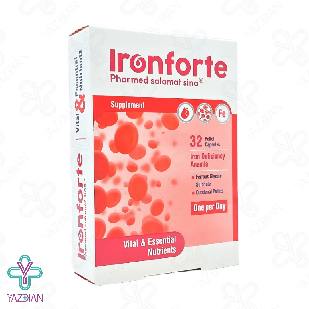 کپسول آهن آیرون فورت فارمد(pharmed Salamat Sina Ironfort 32 Caps) یک مکمل با پلت های دارای پوشش روده ای است و باعث کاهش عوارض گوارشی ناشی از مصرف آهن همچون تهوع، درد و ناراحتیهای معده می شود زیرا داروهایی که پوشش روده ای دارند در محیط اسیدی معده باز نمی شوند و جذب آن ها در دوازدهه که محیطی قلیایی است صورت می گیرد و جذب خون می شوند.