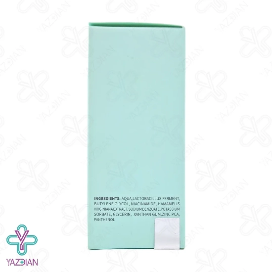 پانتنول، آب، زینکPCA، مخمر لاکتوباسیلوس، زانتان گام، بوتیلن گلایکول، گلیسیرین، نیاسینامید، پتاسیم سوربات، عصاره گیاه هاماملیس، سدیم بنزوات.