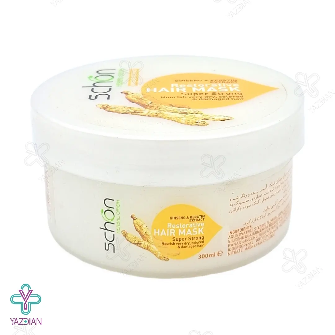 ماسک مو کاسه ای جینسینگ و کراتین شون (با آبکشی) - 300 میلی لیتر (repairer schon keratin and ginseng hair mask 300ml) یک ماسک موی گیاهی با فرمولاسیون ویژه و موثر می باشد که کاملا سازگار با موهای صدمه دیده، رنگ شده و موهای خشک می باشد. این ماسک مو با برخورداری از عصاره ریشه جینسینگ و کراتین هیدرولیز شده، عملکرد فوق العاده ای در ترمیم و بازسازی ساقه موها داشته و به آن ها جانی تازه می بخشد. استفاده از ماسک مو جینسینگ و کراتین شون سبب سهولت در شانه پذیری شده و گره های مو را برطرف می کند. ضمنا به موها نرمی ولطافت بخشیده و درخشندگی و شادابی آن ها را دو چندان می کند.