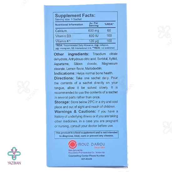 ساشه کلسیم ویتامین کا دی رزاویت (Rozavit Calcium And Vitamin D3 K1 20 Direct Sachets) با دارا بودن ترکیباتی مغذی نظیر ویتامین کا1 و دی 3 به مقدار مناسب در فرمولاسیون خود، می تواند سلامت استخوان ها و دندان ها را حفظ کرده و ضمن جلوگیری از بروز پوکی استخوان، عملکرد سیستم عصبی را نیز بهبود ببخشد.