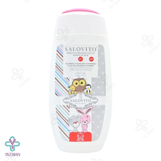 لوسیون مرطوب کننده سالوویتو حاوی 5 درصد آلوئه ورا مناسب کودکان زیر یکسال (Salovito Baby Moisturizing Body Lotion Sensetive Skin 230 ml) با دارا بودن عصاره های گیاهی ارزشمند نظیر آلوئه ورا، بابونه، کالاندولا، روغن زیتون و مواد مؤثر اوسرین و گلیسیرین در فرمولاسیون خود می تواند ضمن آبرسانی و رطوبت رسانی مناسب، مانع از خشکی و ترک خوردگی پوست کودکان شده و نرمی، لطافت و شادابی پوست آنان را افزایش دهد.
