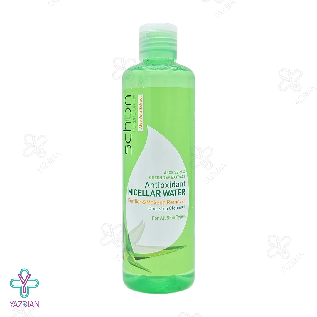 محلول پاک کننده میسلار واتر آنتی اکسیدان شون (Schon Antioxidant Micellar Water 300 ml) با دارا بودن عصاره آلوئه ورا و چای سبز در فرمولاسیون خود می تواند تمامی چربی ها و آلودگی های موجود در سطح پوست پاکسازی کند و مواد آرایشی را به خوبی از روی صورت، لب و چشم ها پاک نماید و ضمن جلوگیری از خشکی پوست، نرمی، لطافت و شادابی پوست را افزایش دهد.