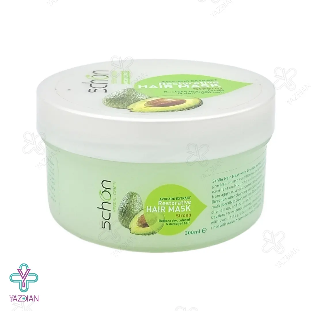 ماسک مو کاسه آی آووکادو شون ( با آبکشی) - 300 میلی لیتر (Schon Restorative Hair Mask With Avocado Extract) با فرمولاسیون ویژه و موثر خود، عملکرد فوق العاده ای در احیا و بازسازی موهای صدمه دیده و نازک داشته و بدلیل برخورداری از مواد مرطوب کننده و آبرسان به موها نرمی و لطافت خاصی می بخشد. ضمنا سرشار از ترکیبات مغذی می باشد که به موها جانی تازه می بخشد. ماسک مو کاسه ای آووکادو شون خشکی موها را از بین برده و از بروز موخوره و ایجاد الکتریسیته ساکن جلوگیری می کند. استفاده از این محصول در حمام توصیه می شود و باید پس از استفاده حتما آبکشی شود.
