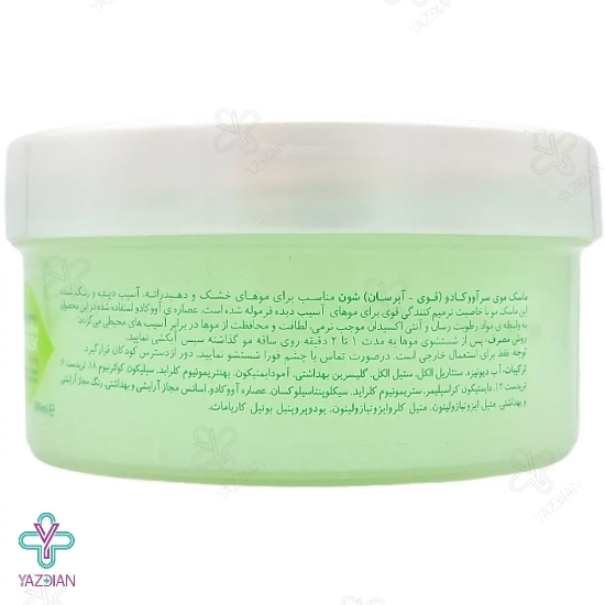 آووکادو موجود در محصول ضد رادیکال های آزاد می باشد و نرمی و لطافت موها را دو چندان می کند. ضمنا آسیب دیدگی ساقه مو ها را برطرف می کند. این ماسک مو برند شون فاقد پارابن است.