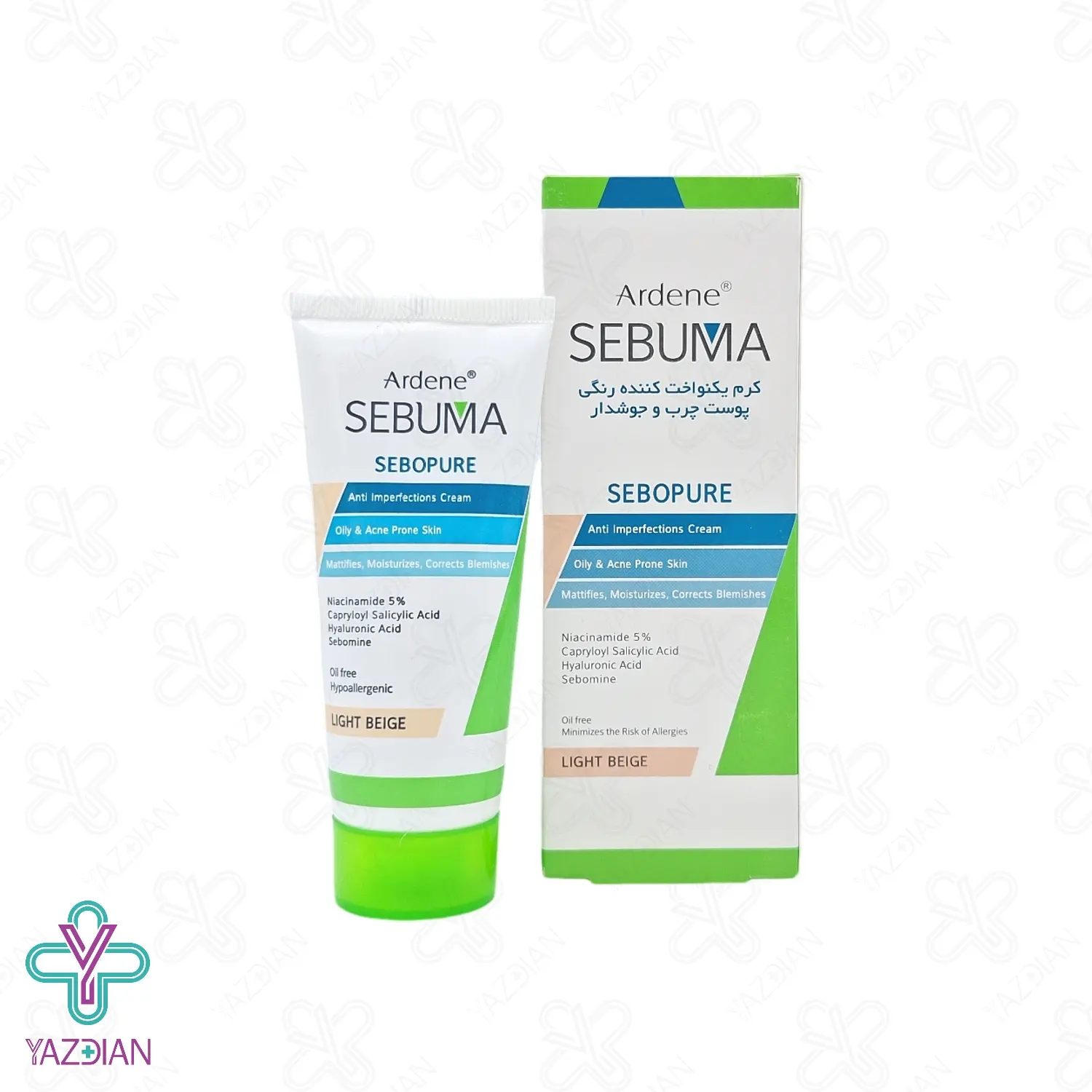 کرم ضد جوش رنگی آردن سبوما - بژ روشن (Sebopure Anti Imperfections Cream For Oily And Acne Prone Skin) کاور بسیار بالا و نچرال به رنگ بژ طبیعی داشته و کلیه عیوب پوستی از جمله جای جوش و آکنه و تیرگی های پوستی را می پوشاند. این محصول به هیچ وجه پوست را مات نکرده و باعث ایجاد براقی نمی شود. ضمنا با کنترل ترشحات غدد چربی و جمع کردن منافذ باز پوستی، کومدون های سر سیاه و سر سفید را از بین برد و مانع از بروز مجدد آن ها می شود. ضمنا خاصیت آنتی باکتریالی نیز دارد. این محصول فاقد چربی است و کاملا مناسب پوست چرب، جوشدار و آکنه ای می باشد.