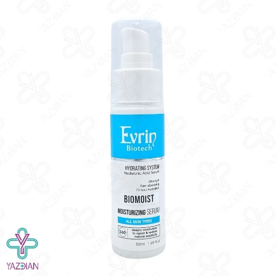 سرم مرطوب کننده صورت خشک بایومویست اورین - 50 میلی لیتر (Serum Moisturizing Evrin 50ml) با آبرسانی عمقی و طولانی مدت (72 ساعته) میزان نرمی و لطافت پوست را دو چندان می کند. این محصول با فرمولاسیون ویژه خود، شادابی و طراوت پوست شما را دو چندان کرده و سبب روشنی و جوانی آن می شود. بعلاوه از بروز قرمزی، التهاب و تحریکات پوستی ممانعت کرده و از حساسیت های پوستی جلوگیری می کند. این سرم قابل استفاده برای پوست صورت و گردن می باشد و برای تمامی پوست ها قابل استفاده است.