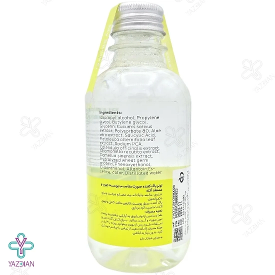 آب، ایزوپروپیل الکل، رنگ مجاز آرایشی و بهداشتی، پروپیلن گلایکول، اسانس مجاز آرایشی و بهداشتی، بوتیلن گلایکول، آلانتویین، گلیسیرین، دی پنتانول، عصاره ی خیار، فنوکسی اتانول، پلی سوربات 80، پروتئین هیدرولیز شده ی جوانه ی گندم، عصاره ی آلوئه ورا، عصاره ی بابونه، سالیسیلیک اسید، عصاره ی کالاندولا، عصاره ی درخت چای، سدیم پی سی ای.