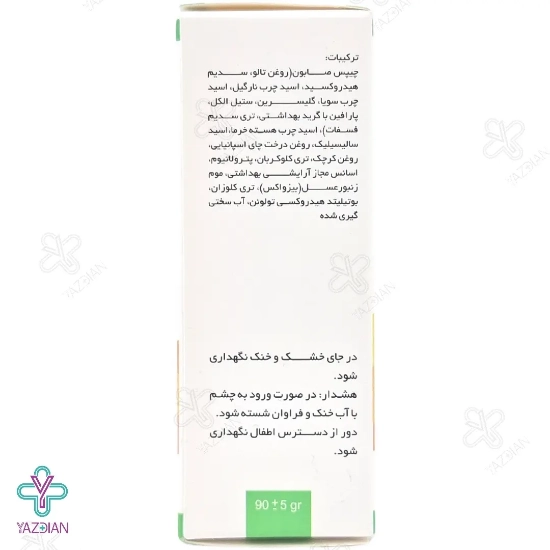 روغن درخت چای از ترکیبات به کار رفته در این صابون است که دارای خواص ضد ویروسی بسیار عالی بوده، پوست را ضدعفونی و باکتری های زیان آور را برطرف می کند. این ترکیب هم چنین سلول های پوست را تقویت و مانع از پیری زودرس شده و لکه های پوستی را نیز رفع می کند. تری کلوکاربان نیز از دیگر ترکیبات موجود در این محصول است که جوش های چرکی ایجاد شده در پوست را کم کرده و برای تمامی پوست ها حتی پوست چرب مناسب بوده و بوی بد بدن را نیز برطرف می کند.