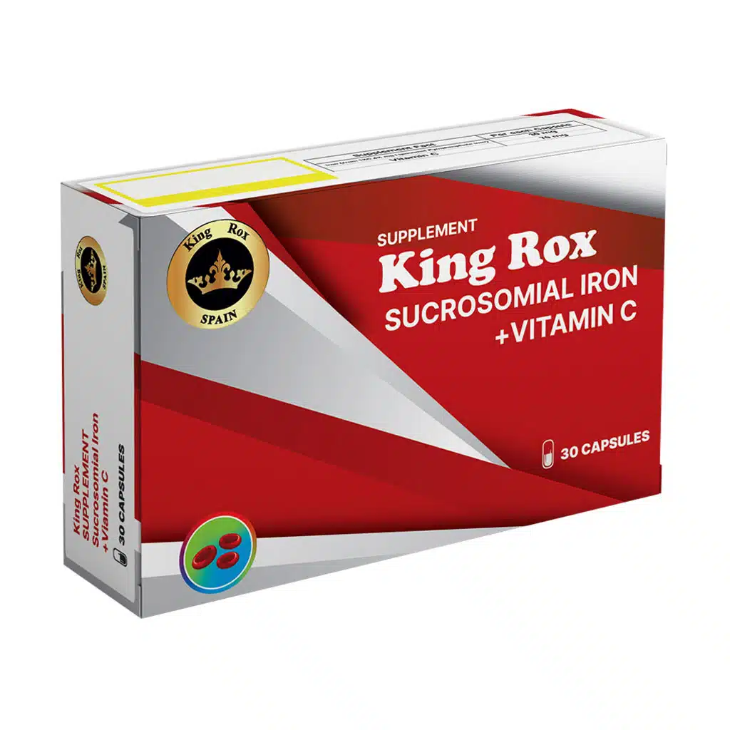 کپسول آهن سوکروزومیال ویتامین ث کینگ راکس - 30 عددی (Sucrosomial Iron + Vitamin C King Rox 30 caps) یک مکمل غذایی عالی جهت تامین آهن مورد نیاز بدن می باشد. آهن فرموله شده در این محصول به گونه ای است که کمترین عوارض گوارشی را درپی خواهد داشت و به افراد با بیماری های گوارشی توصیه می شود. از علائم ناشی از کم خونی می توان به خستگی زود هنگام، رنگ پریدگی، بی حالی و ریزش مو اشاره داشت. این کسپول به دلیل فراهم زیستی بالایی که دارد، قدرت جذب بالایی هم دارد.