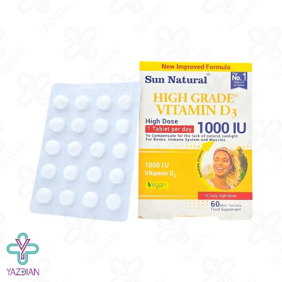 قرص ویتامین د3 1000 واحد های گرید سان نچرال - 60 عددی (Sun Natural High Grade Vitamin D3 1000 Iu 60 Tablets) ساخت شرکت محبوب و معروف سان نچرال کشور انگلستان می باشد که ویتامین دی مورد نیاز بدن به خصوص برای افرادی که در معرض آفتاب می باشند را تامین می کند. مصرف این قرص در حفظ سلامت استخوان ها موثر می باشد و سیستم ایمنی بدن را تقویت می کند. در اثر مصرف این قرص، جذب کلسیم و فسفر در بدن بهبود پیدا می کند و در نهایت نقش بسیار موثری در حفظ سلامت استخوان ها و عضلات خواهد داشت. این قرص بدون استفاده از تست حیوانی بهره وری شده و در آن از مواد مضر از جمله نگهدارنده ها، رنگ مصنوعی، مخمر و نمک استفاده نشده است و بدین خاطر یک انتخاب سالم و مطمئن به شمار می رود.