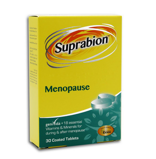 قرص منوپوز (بهبود علائم یائسگی) سوپرابیون (Suprabion Menopause tablets - 30 pcs ) یک مکمل مناسب جهت حفظ سلامت عمومی و بهبود علائم یائسگی می باشد این محصول دارای مولتی ویتامین و مواد معدنی مانند آهن، زینک، مس، سلنیوم و کروم می باشد که موجب افزایش انرژی، تقویت سیستم ایمنی و تقویت سلامت پوست، مو وناخن و بهبود استحکام استخوان ها می شود قرص منوپوز موجب کاهش و بهبود گرگرفتگی، تعریق شبانه، خشکی واژن، اضطراب، نوسانات خلقی، ضعف و افسردگی می شود این محصول با دارا بودن ویتامین D موجب حفظ استخوان های قوی و سالم در دروان یائسگی می شود با افزایش سن و یائسگی تراکم استخوان ها کاهش یافته و خطر پوکی استخوان افزایش پیدا می کند قرص منوپوز با تنظیم فعالیت های هورمونی موجب بهبود علائم یائسگی و حفظ سلامت عمومی بانوان می شود و موجب افزایش انرژی در بانوان می شود.