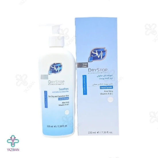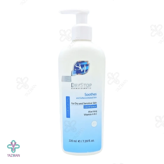 پن مایع غیر صابونی درای استاپ پوست خشک اس وی آی (SVI Dry Stop Liquid Cleaning for Dry and Sensitive Skin 220 ml) یک محصول شستشو و پاک کننده مناسب برای شستن پوست های خشک و حساس است. این محصول یک پاک کننده ی ملایم و غیر صابونی بوده و در آن مواد قلیایی به کار نرفته و به همین دلیل با PH طبیعی پوست سازگار است. یکی دیگر از ویژگی های این پن مایع این است که مانع از کم آبی و آسیب به پوست شده و علاوه بر حفظ تعادل آن در هنگام تمیزی سبب تقویت لایه ی دفاعی پوست می شود.