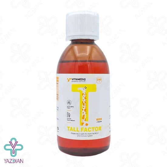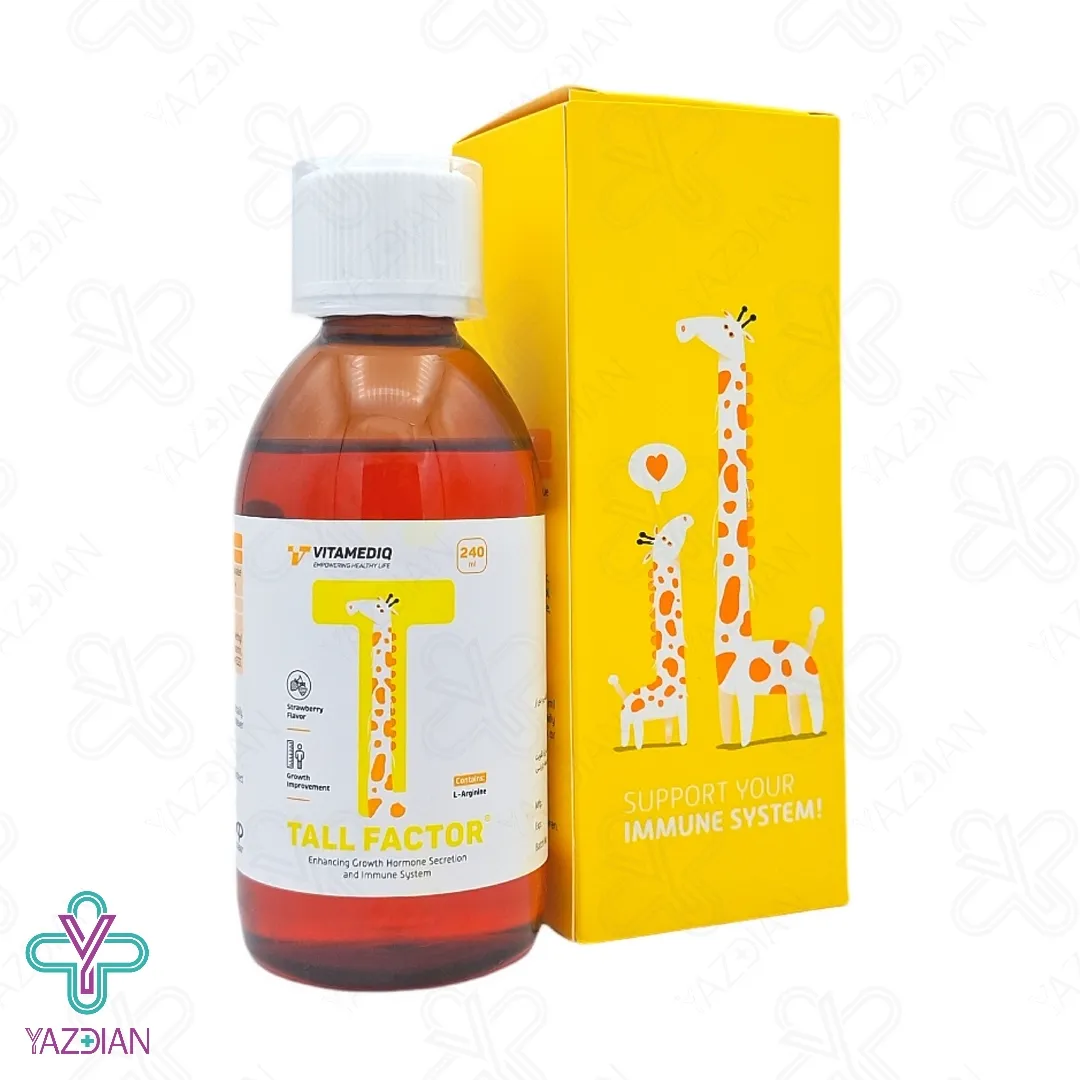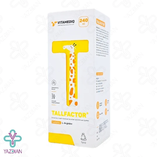داشتن قد بلند در فرزندان همیشه یک موضوع مهم برای والدین می باشد و به عنوان یک نشانه از سلامتی در نظر گرفته می شود، داشتن تغذیه خوب در کنار استفاده از مکمل ها و داروهای تقویت رشد از راه هایی است که معمولا والدین انتخاب می کنند، داشتن قد متناسب در کودکان در جامعه یک نشانه از رشد خوب و وضعیت سلامت کلی می باشد بنابراین رشد قد کودکان یک موضوع بسیار مهم می باشد. شربت تقویت سیستم ایمنی تالفکتور(Tallfactor immune system strengthening syrup – 240 ml) یک مکمل مناسب برای کودکان می باشد که موجب ترشح هورمون رشد شده و سیستم ایمنی را نیز تقویت می کند، ال آرژنین موجود در این محصول یک اسید آمینه ضروری می باشد که موجب افزایش رشد کودکان شده و از قندهای موجود در بدن نوزادان انرژی مورد نیاز برای رشد را تامین می کند، ال آرژنین نقش مهمی در رشد استخوان ها و عضله دارد این ماده با تاثیر بر نیتریک اسید موجب بهبود گردش خون شده و به دنبال آن مواد مغذی و اکسیژن به بافت ها از جمله صفحات رشد در استخوان ها انتقال پیدا می کند، شربت تالفکتور دارای طعم توت فرنگی می باشد و همین موضوع استفاده آن را برای کودکان راحت تر می کند آرژنین عوارضی برای کودکان نداشته و محرک رشد خوبی می باشد، در هر 3 میلی لیتر این محصول 250 میلی گرم ال آرژنین وجود دارد. این محصول علاوه بر رشد کودک موجب تقویت قلب و عروق، افزایش حجم عضلات بدن نیز می شود.