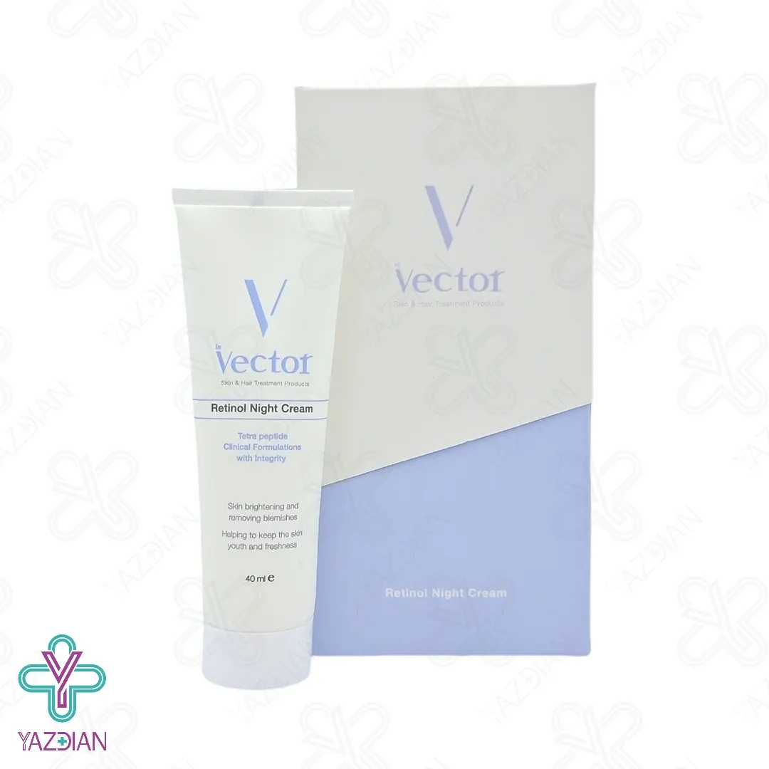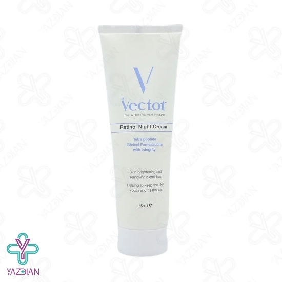 کرم رتینول شب وکتور - 40 میلی لیتر (Vector Retinol Night Cream) با بهره گیری از مشتقات ویتامین C، محرک کلاژن سازی پوست می باشد و نقش موثری در روشن سازی پوست دارد و به پوست درخشانی و شفافیت می بخشد. رتینول یکی از ترکیبات موثر این فراورده می باشد که آن نیز محرک کلاژن و الاستین سازی پوست می باشد و جای جوش و آکنه را بهبود می بخشد و محو می کند.