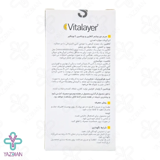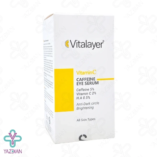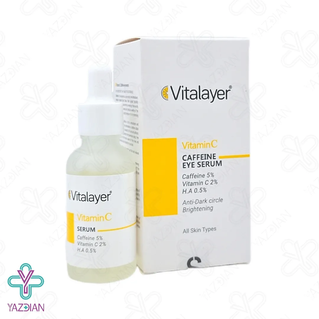 سرم دور چشم کافئین و ویتامین ث ویتالیر - 30 میلی لیتر (Vitalayer Caffeine And Vitamin C Eye Serum ۳۰ Ml) با بهره گیری از فرمولاسیون ویژه و منحصر به فرد خود، از بین برنده عالی تیرگی و سیاهی های دور چشم می باشد. کافئین بکار گیری شده در این سرم با انقباض عروق دور چشم، یک راه عالی برای از بین بردن تیرگی های دور چشم را ایجاد می کند. در صورت استفاده موضعی از این سرم، بطرز چشم گیری پف و ورم دورچشم را می خواباند. همچنین عصاره های گیاهی بکارگیری شده در این سرم خاصیت آنتی قدرتمندی را دارند که با مهار فعالیت رادیکال های آزاد، تاثیرات منفی اشعه فرابنفش را به حداقل می رساند.