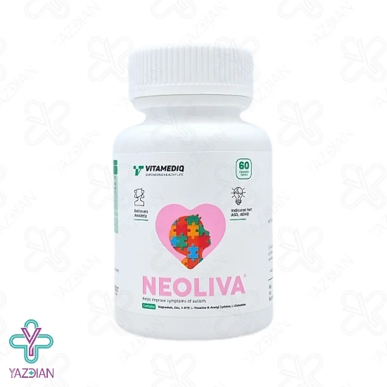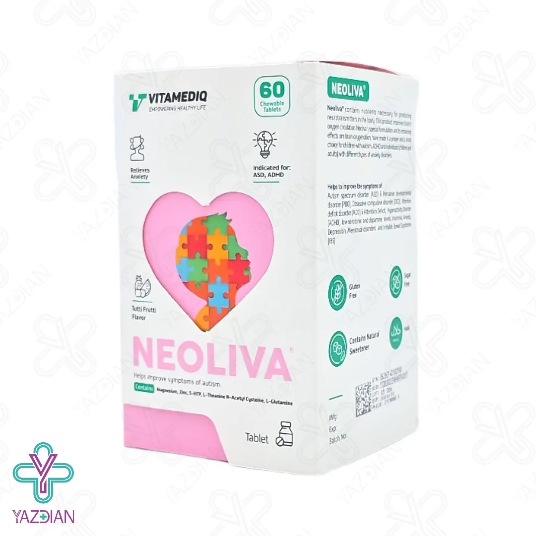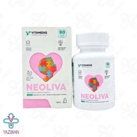 قرص جویدنی نئولیوا ویتامدیک (Vitamediq Neoliva 60 Chewable Tablets) باعث اکسیژن رسانی به مغز شده و به همین دلیل این محصول برای کودکانی که به اختلال پیش فعالی و اوتیسم مبتلا هستند مناسب است، از دیگر ویژگی های این محصول این است که برای بسیاری از اختلالات اضطرابی مختلف در افراد بزرگ سال و کودکان نیز مناسب است، این قرص هم چنین به بهبود اختلال فراگیر رشد و اختلال وسواس فکری و عملی کمک کرده و نیز در افراد بزرگ سال سندروم روده ی تحریک پذیر، بی خوابی، اضطراب، افسردگی و اختلالات قاعدگی را برطرف کرده و هم چنین کمبود دوپامین و سروتونین را در بدن جبران می کند، ان استیل سیستئین از ترکیبات موجود در این محصول است که دارای خواص آنتی اکسیدانی و ضد التهابی بوده و اضطراب، پیش فعالی و تحریک پذیری را کاهش داده و در ارتباط اجتماعی و آگاهی کودکانی که یه اوتیسم مبتلا هستند نیز تاثیرگذار است، هیدروکسی تریپتوفان نیز در بهبود خلق و خو و کم شدن اضطراب موثر است، ال تیانین از دیگر ترکیبات موجود در این قرص بوده و به پیام رسانی و انتقال دهنده های عصبی در مغز کمک کرده و نیز برای ایجاد آرامش و کم شدن اختلالات خواب مفید است، وجود ال گلوتامین در این محصول نیز سلامت مغز را تقویت کرده و در کاهش استرس و اضطراب بسیار تاثیرگذار است.