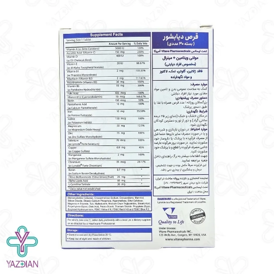 قرص مولتی ویتامین دیابتی دیابشور ویتان - 30 عددی (Vitane Diabesure 30 Tabs) ضمن تامین نیاز های بدن و افزایش سطح سلامت عمومی، عوارض بیماری را نیز تا حد زیادی کنترل می کند. این قرص با بهره گیری از ویتامینهای گروه B، D و E، عملکرد سیستم بینایی و عصبی فرد دیابتی را بهبود می بخشد و در تقویت سیستم ایمنی بدن نیز موثر است.