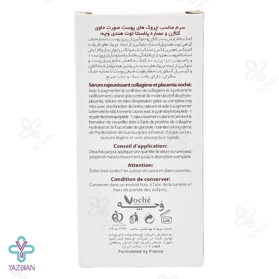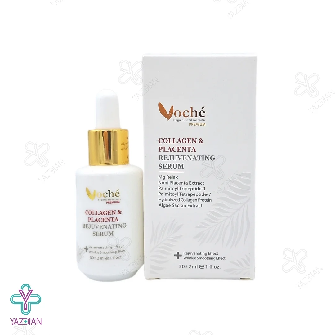 سرم ضد چروک وچه حاوی کلاژن و عصاره پلاسنتا (Voche Collagen And Placenta Rejuvenating Serum 30 ml) با دارا بودن دو ترکیب ارزشمند کلاژن و عصاره پلاسنتا در فرمولاسیون خود می تواند همانند بوتاکس عمل کرده و چین و چروک های پوستی را برطرف نماید و مانع از ایجاد چروک های جدید در پوست شود.